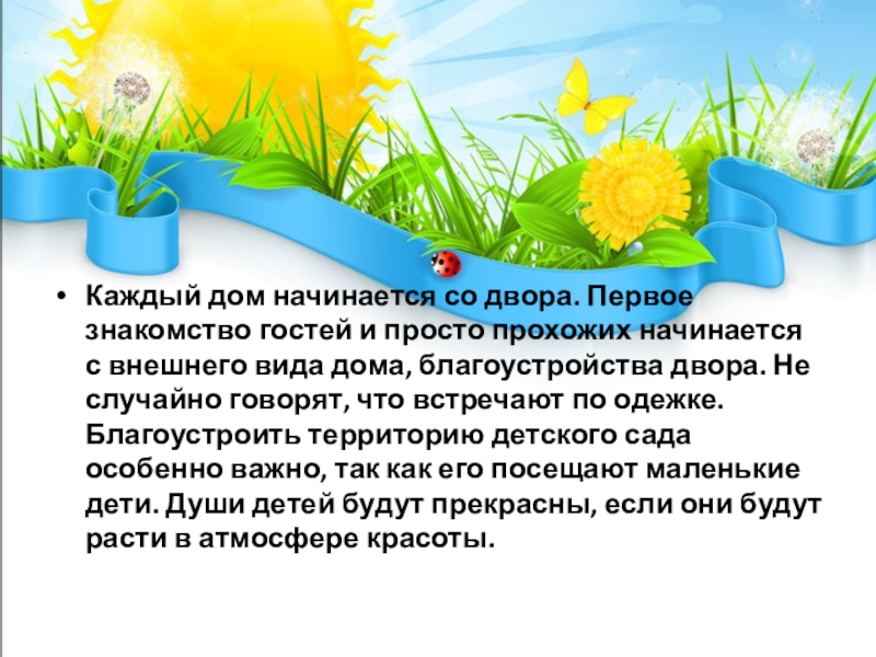начинается с внешнего вида дома, благоустройства двора. Не случайно говорят, что встречают по одежке. Благоустроить территорию детского сада особенно важно, так как его посещают маленькие дети. Души детей будут прекрасны, если они будут расти в атмосфере красоты.