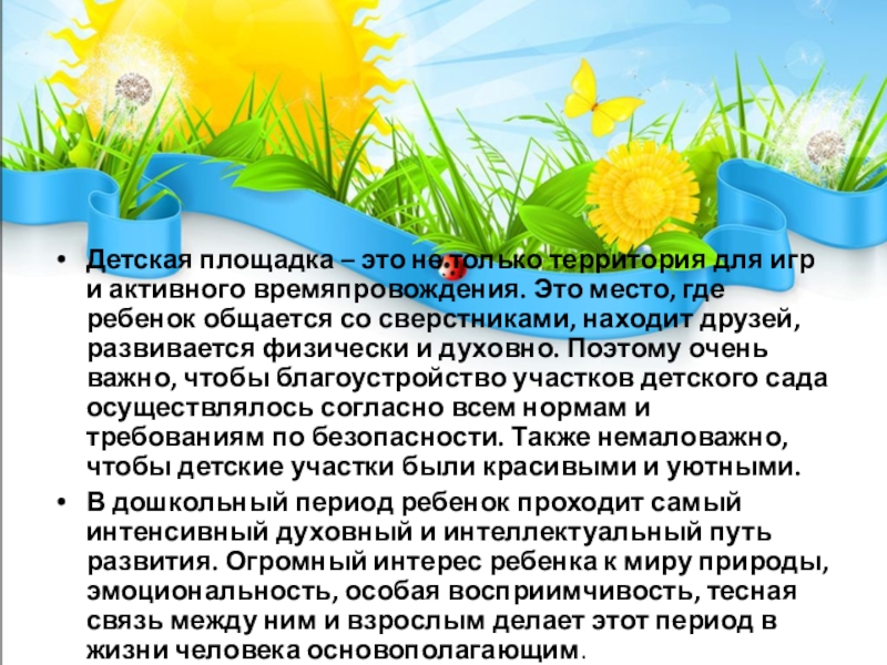 времяпровождения. Это место, где ребенок общается со сверстниками, находит друзей, развивается физически и духовно. Поэтому очень важно, чтобы благоустройство участков детского сада осуществлялось согласно всем нормам и требованиям по безопасности. Также немаловажно, чтобы детские участки были красивыми и уютными.