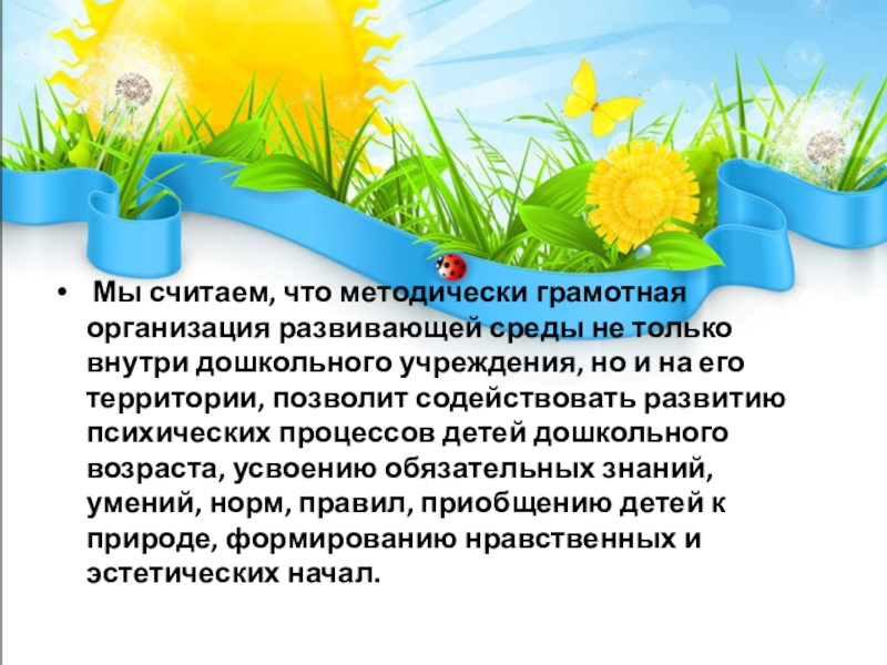 Слайд 13 Мы считаем, что методически грамотная организация развивающей среды не только внутри