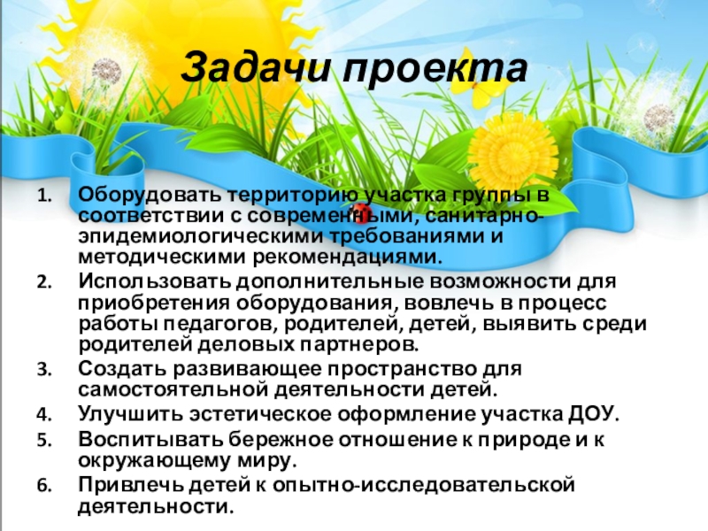 Оборудовать территорию участка группы в соответствии с современными, санитарно-эпидемиологическими требованиями