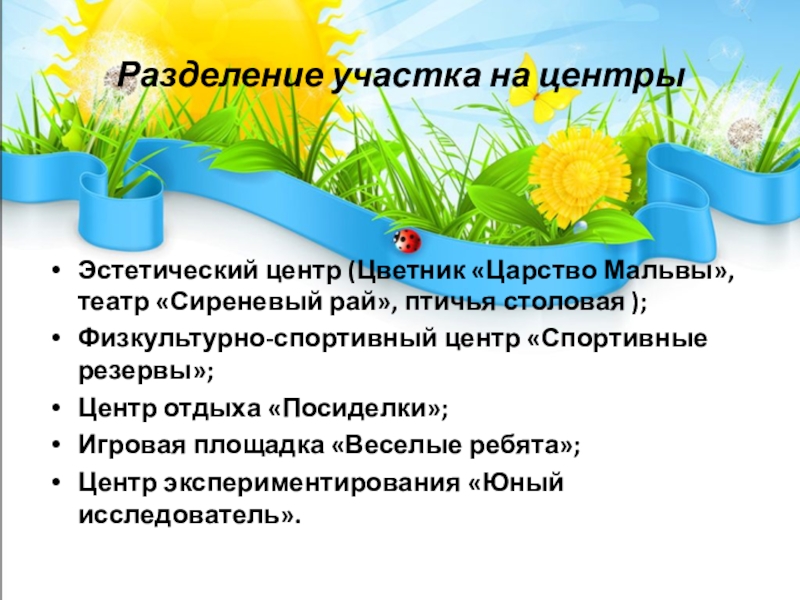 дошкольного учреждения, но и на его территории, позволит содействовать развитию психических процессов детей дошкольного возраста, усвоению обязательных знаний, умений, норм, правил, приобщению детей к природе, формированию нравственных и эстетических начал.