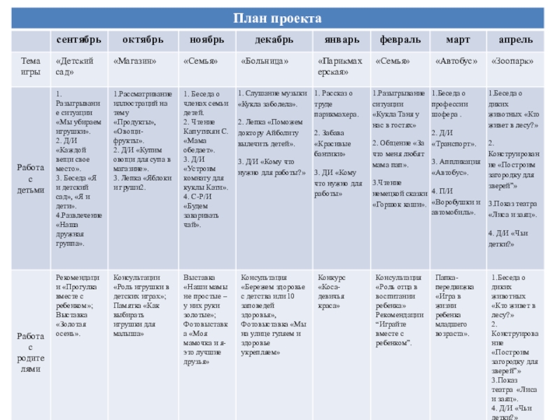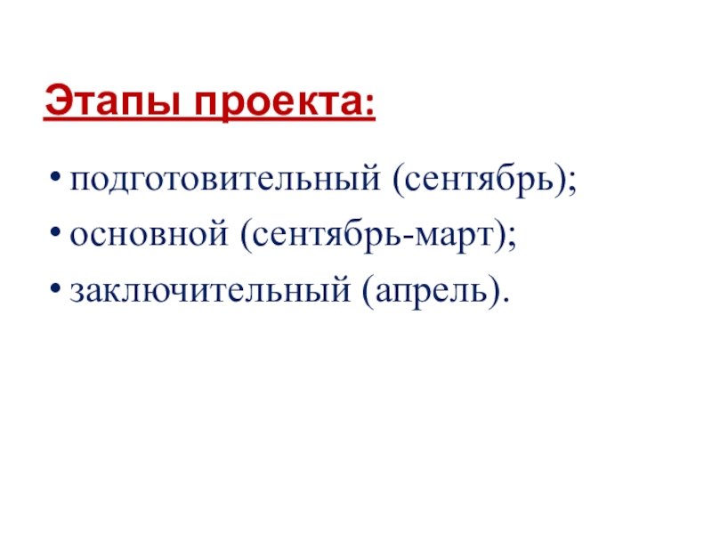 Этапы проекта:подготовительный (сентябрь);основной (сентябрь-март);заключительный (апрель).