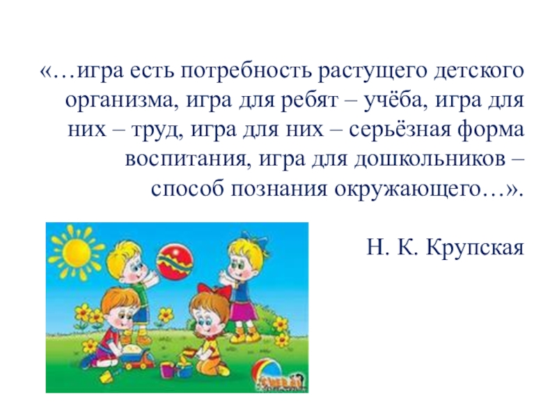 игра для них – труд, игра для них – серьёзная форма воспитания, игра для дошкольников – способ познания окружающего…». Н. К. Крупская