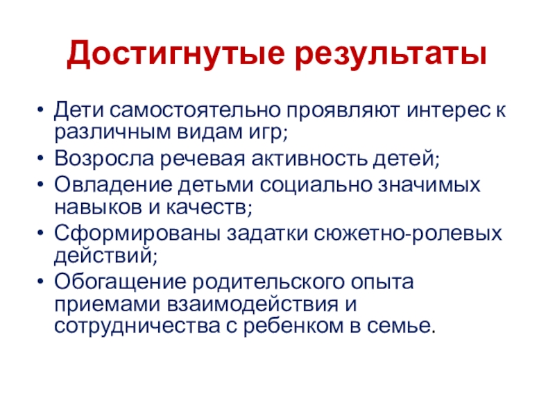 Достигнутые результатыДети самостоятельно проявляют интерес к различным видам игр;Возросла речевая активность детей;Овладение детьми социально значимых навыков и