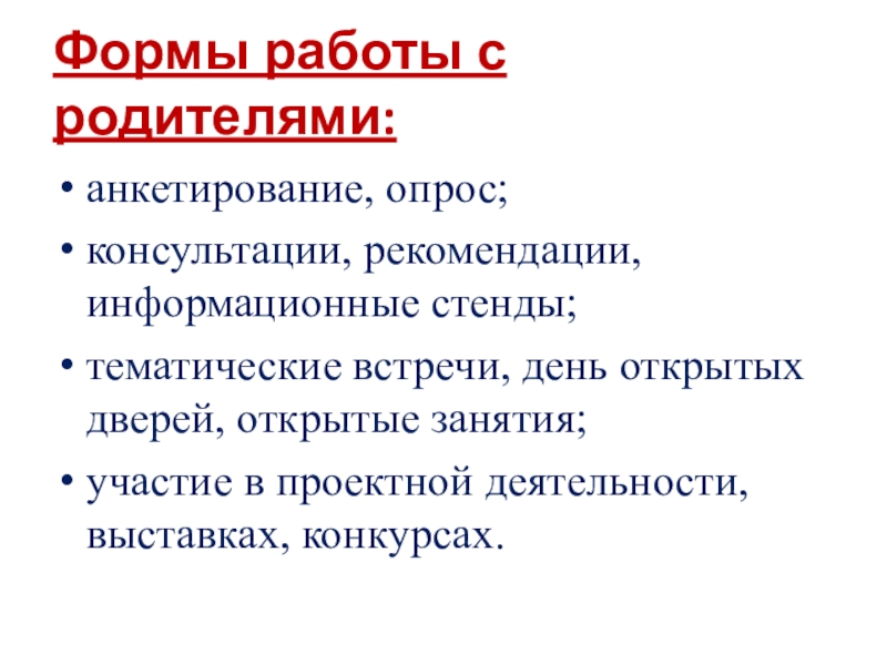 Формы работы с родителями:анкетирование, опрос;консультации, рекомендации, информационные стенды;тематические встречи, день открытых дверей, открытые занятия;участие в проектной деятельности,
