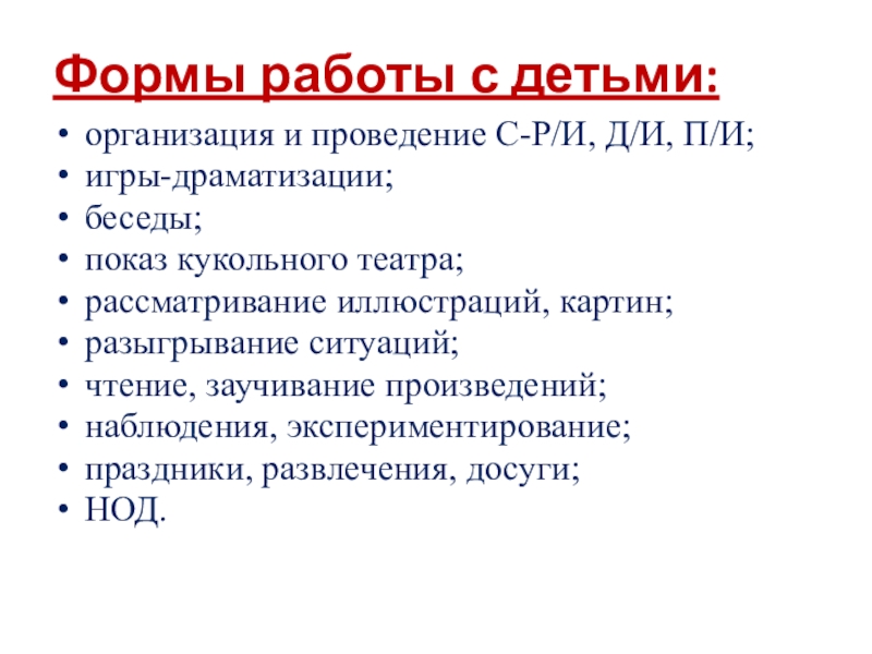 Формы работы с детьми:организация и проведение С-Р/И, Д/И, П/И;игры-драматизации;беседы;показ кукольного театра;рассматривание иллюстраций, картин;разыгрывание ситуаций;чтение, заучивание произведений;наблюдения, экспериментирование;праздники,