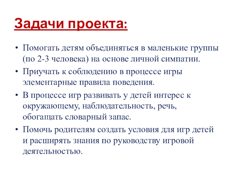 Задачи проекта:Помогать детям объединяться в маленькие группы (по 2-3 человека) на основе личной симпатии.Приучать к соблюдению в