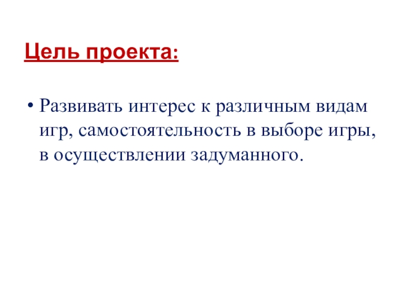 Цель проекта:  Развивать интерес к различным видам игр, самостоятельность в выборе игры, в осуществлении