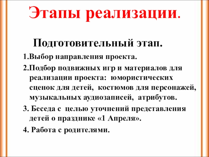 2.Подбор подвижных игр и материалов для реализации проекта: юмористических сценок для детей, костюмов для персонажей, музыкальных аудиозаписей, атрибутов.