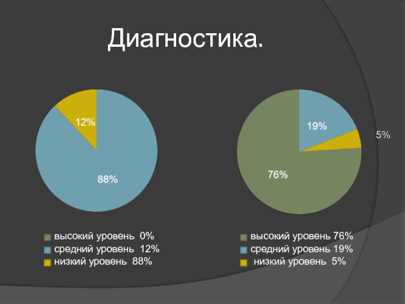 Диагностика.средний уровень 12%низкий уровень 88%средний уровень 19%низкий уровень 5%высокий уровень 76%высокий уровень 0%