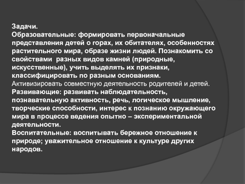 Задачи.Образовательные: формировать первоначальные представления детей о горах, их обитателях, особенностях растительного мира, образе жизни людей. Познакомить со