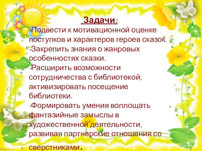 Задачи:-Подвести к мотивационной оценке поступков и характеров героев сказок. -Закрепить знания о жанровых особенностях сказки. -Расширить