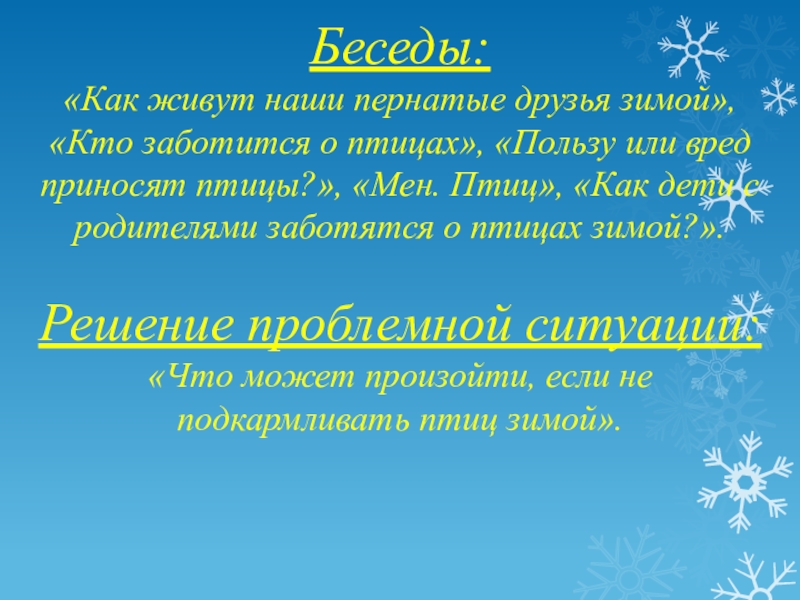 «Как живут наши пернатые друзья зимой», «Кто заботится о птицах», «Пользу