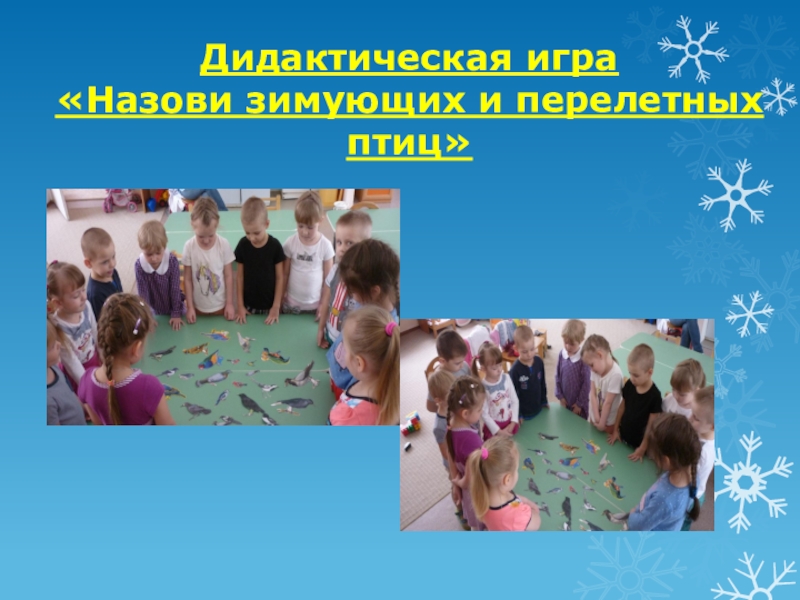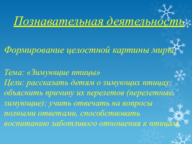 детям о зимующих птицах, объяснить причину их перелетов (перелетные, зимующие); учить отвечать на вопросы полными ответами, способствовать воспитанию заботливого отношения к птицам.