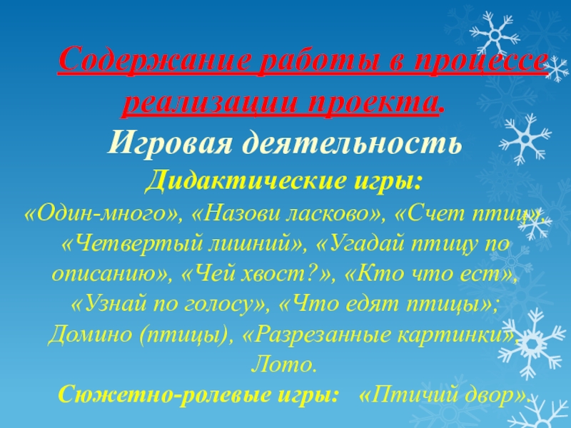 «Один-много», «Назови ласково», «Счет птиц», «Четвертый лишний», «Угадай птицу по описанию», «Чей хвост?», «Кто что ест», «Узнай по голосу», «Что едят птицы»;