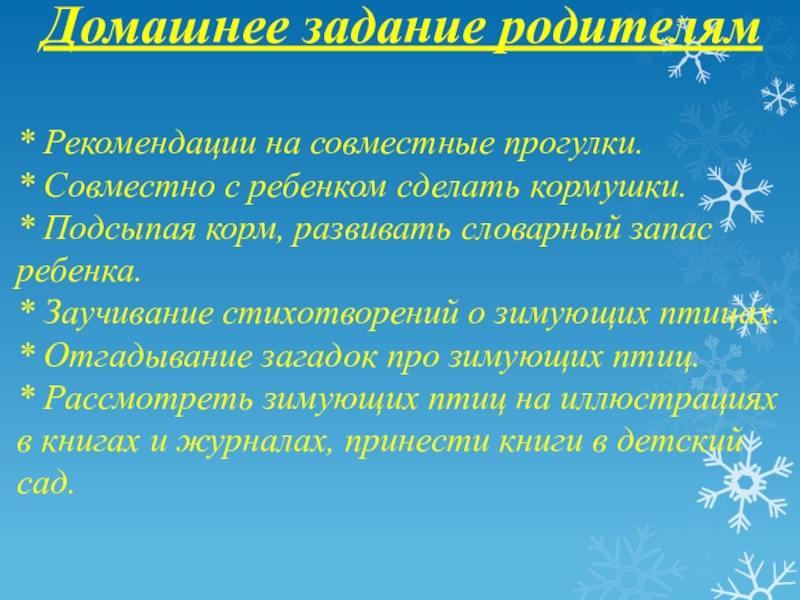 * Рассмотреть зимующих птиц на иллюстрациях в книгах и журналах, принести книги в детский сад.