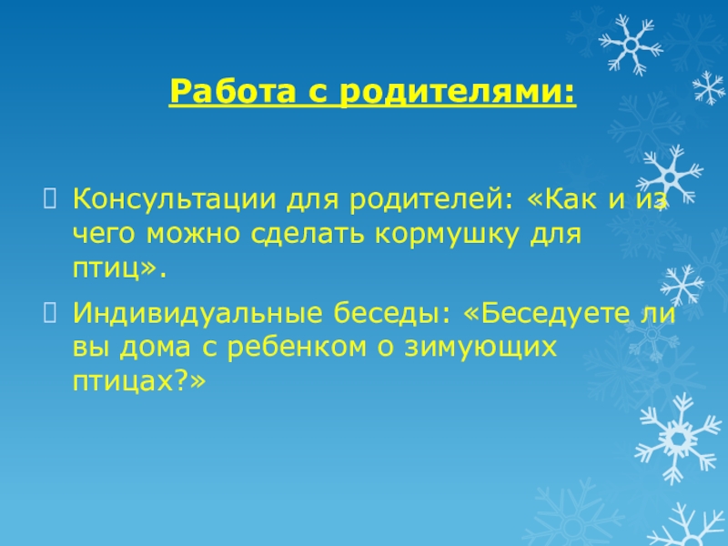 Индивидуальные беседы: «Беседуете ли вы дома с ребенком о зимующих птицах?»
