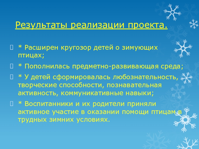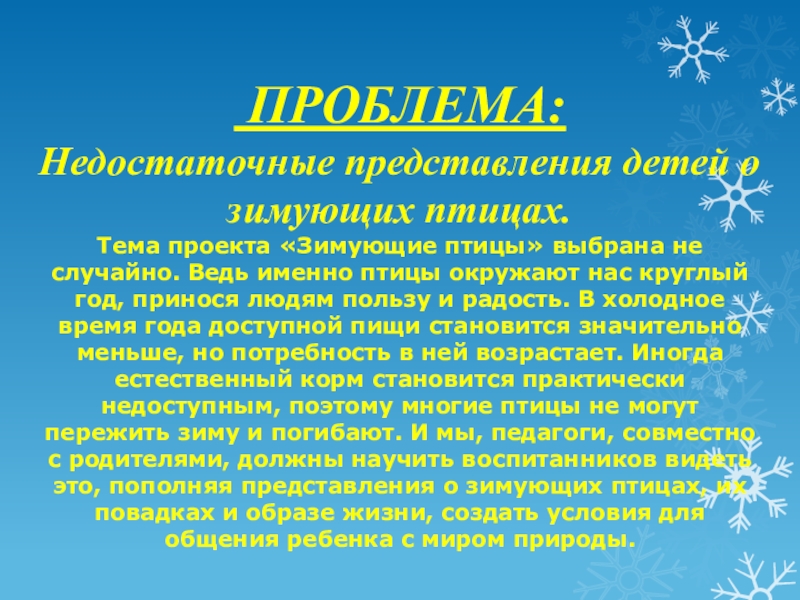 не случайно. Ведь именно птицы окружают нас круглый год, принося людям пользу и радость. В холодное время года доступной пищи становится значительно меньше, но потребность в ней возрастает. Иногда естественный корм становится практически недоступным, поэтому многие птицы не могут пережить зиму и погибают. И мы, педагоги, совместно с родителями, должны научить воспитанников видеть это, пополняя представления о зимующих птицах, их повадках и образе жизни, создать условия для общения ребенка с миром природы.