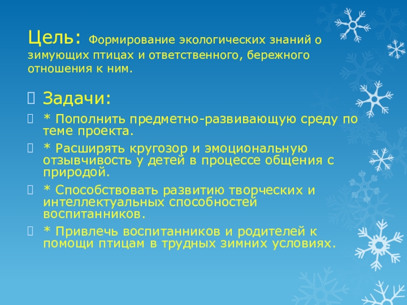 Слайд 6Цель: Формирование экологических знаний о зимующих птицах и ответственного, бережного отношения
