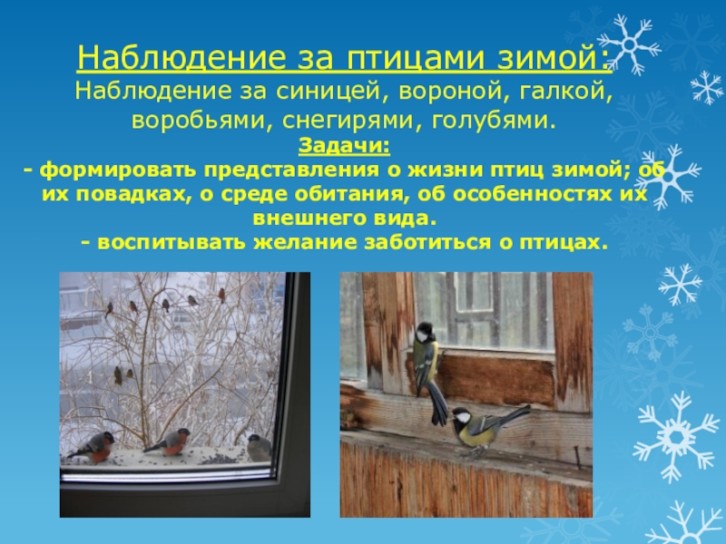 Наблюдение за синицей, вороной, галкой, воробьями, снегирями, голубями.