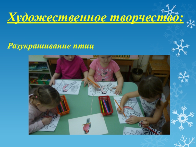 формировать представления о жизни птиц зимой; об их повадках, о среде обитания, об особенностях их внешнего вида.
