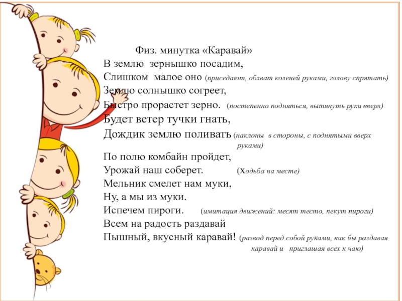 Пышный, вкусный каравай! (развод перед собой руками, как бы раздавая ……………………………………………………….каравай и приглашая всех к чаю)