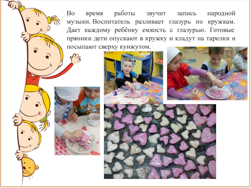Слайд 23Во время работы звучит запись народной музыки. Воспитатель разливает глазурь по кружкам.