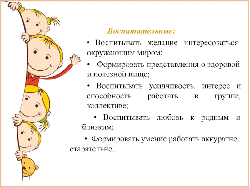 • Развивать у детей интерес к приготовлению пищи;……….…………… • Развивать