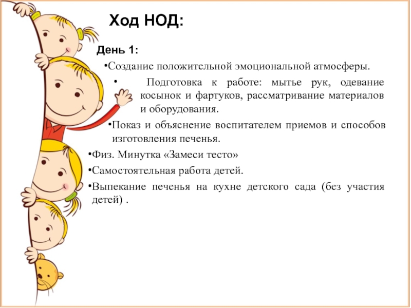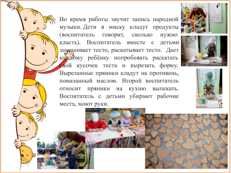 (воспитатель говорит, сколько нужно класть). Воспитатель вместе с детьми замешивает тесто, раскатывает тесто. Дает каждому ребёнку попробовать раскатать свой кусочек теста и вырезать форму. Вырезанные пряники кладут на противень, помазанный маслом. Второй воспитатель относит пряники на кухню выпекать. Воспитатель с детьми убирают рабочие места, моют руки.