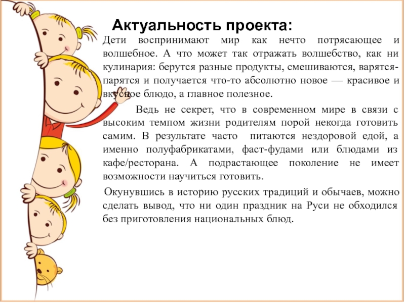 Ведь не секрет, что в современном мире в связи с высоким темпом жизни родителям порой некогда готовить самим. В результате часто питаются нездоровой едой, а именно полуфабрикатами, фаст-фудами или блюдами из кафе/ресторана. А подрастающее поколение не имеет возможности научиться готовить.