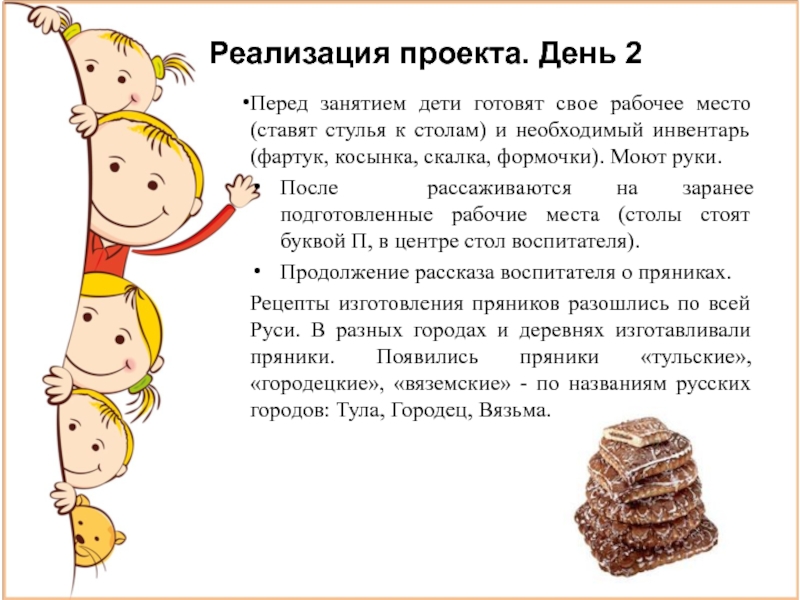 место (ставят стулья к столам) и необходимый инвентарь (фартук, косынка, скалка, формочки). Моют руки.