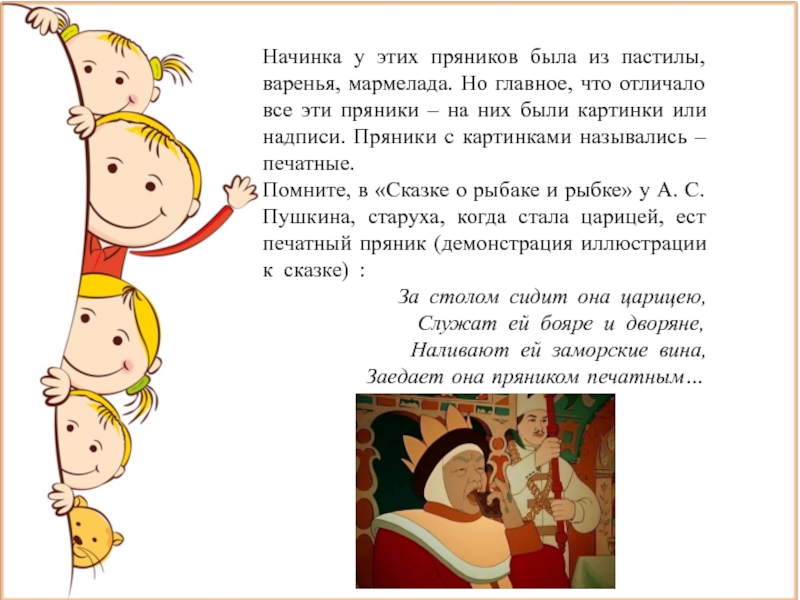 Помните, в «Сказке о рыбаке и рыбке» у А. С. Пушкина, старуха, когда стала царицей, ест печатный пряник (демонстрация иллюстрации к сказке) :………………………………………..