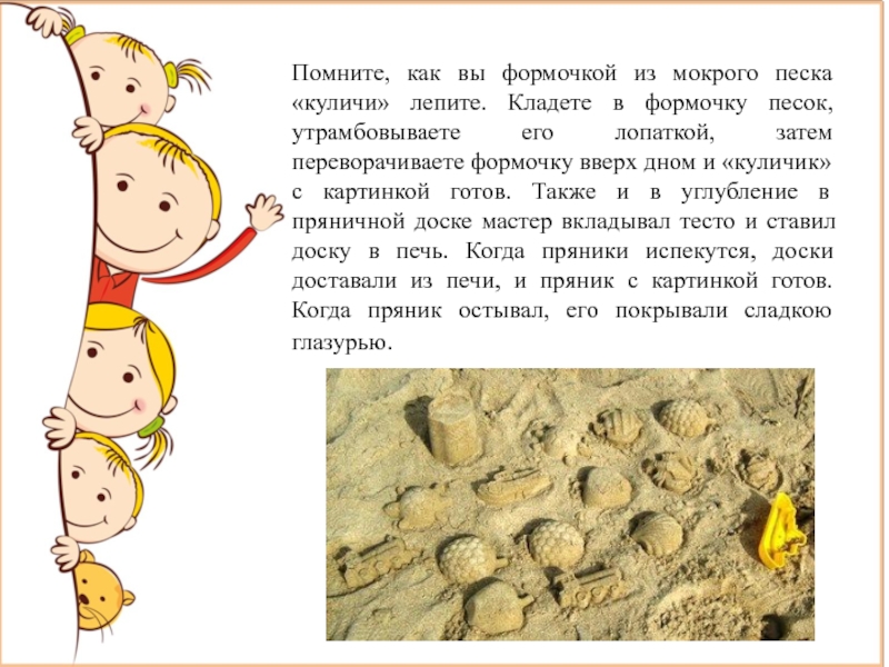 формочку песок, утрамбовываете его лопаткой, затем переворачиваете формочку вверх дном и «куличик» с картинкой готов. Также и в углубление в пряничной доске мастер вкладывал тесто и ставил доску в печь. Когда пряники испекутся, доски доставали из печи, и пряник с картинкой готов. Когда пряник остывал, его покрывали сладкою глазурью. .