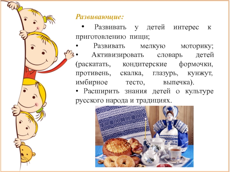 • Активизировать словарь детей (раскатать, кондитерские формочки, противень, скалка, глазурь, кунжут, имбирное тесто, выпечка). .