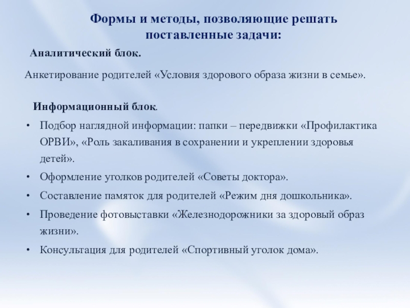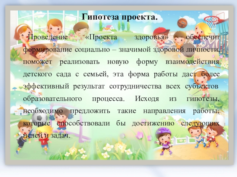 здоровой личности, поможет реализовать новую форму взаимодействия детского сада с семьей, эта форма работы даст более эффективный результат сотрудничества всех субъектов образовательного процесса. Исходя из гипотезы, необходимо предложить такие направления работы, которые способствовали бы достижению следующих целей и задач.