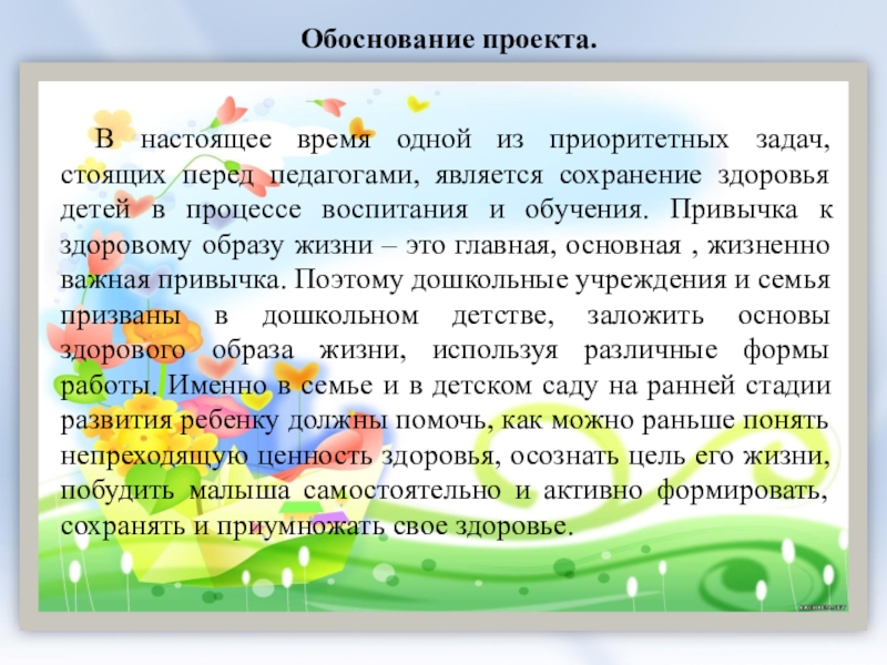 является сохранение здоровья детей в процессе воспитания и обучения. Привычка к здоровому образу жизни – это главная, основная , жизненно важная привычка. Поэтому дошкольные учреждения и семья призваны в дошкольном детстве, заложить основы здорового образа жизни, используя различные формы работы. Именно в семье и в детском саду на ранней стадии развития ребенку должны помочь, как можно раньше понять непреходящую ценность здоровья, осознать цель его жизни, побудить малыша самостоятельно и активно формировать, сохранять и приумножать свое здоровье.