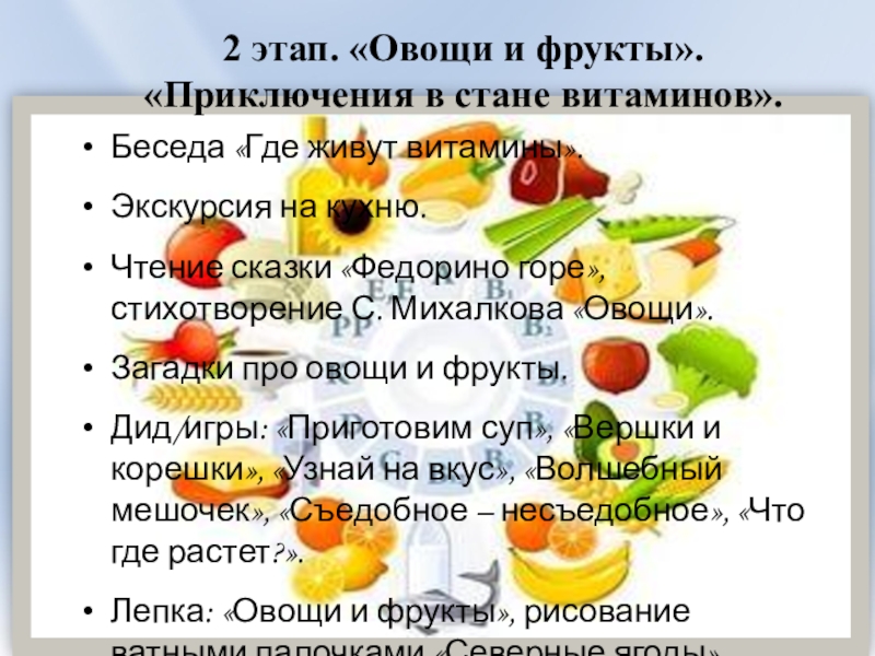 Слайд 162 этап. «Овощи и фрукты». «Приключения в стане витаминов».