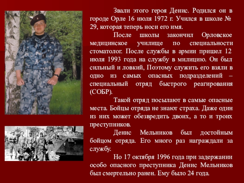 Но 17 октября 1996 года при задержании особо опасного преступника Денис Мельников был смертельно ранен. Ему было 24 года.