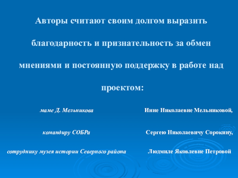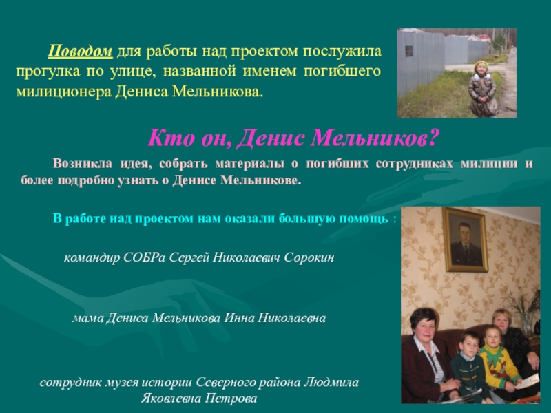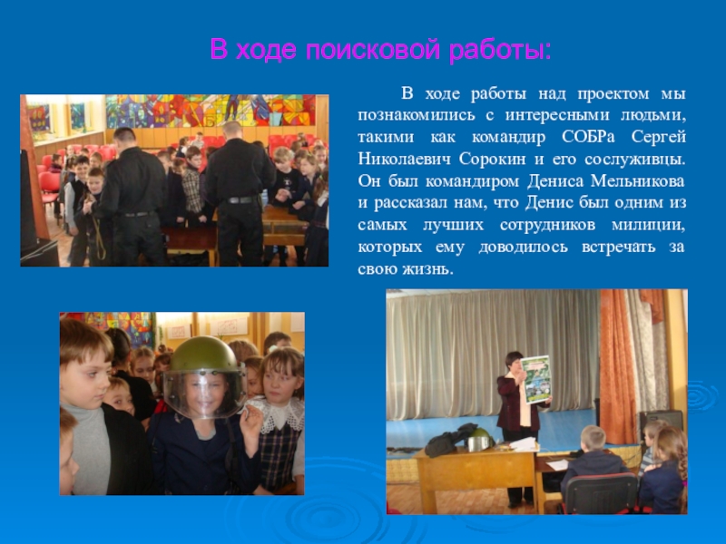 интересными людьми, такими как командир СОБРа Сергей Николаевич Сорокин и его сослуживцы. Он был командиром Дениса Мельникова и рассказал нам, что Денис был одним из самых лучших сотрудников милиции, которых ему доводилось встречать за свою жизнь.