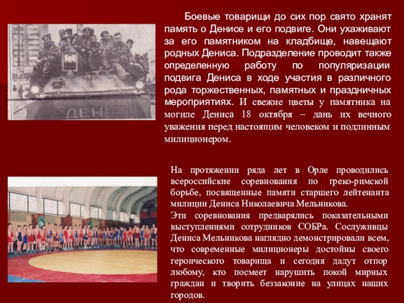 его подвиге. Они ухаживают за его памятником на кладбище, навещают родных Дениса. Подразделение проводит также определенную работу по популяризации подвига Дениса в ходе участия в различного рода торжественных, памятных и праздничных мероприятиях. И свежие цветы у памятника на могиле Дениса 18 октября – дань их вечного уважения перед настоящим человеком и подлинным милиционером.