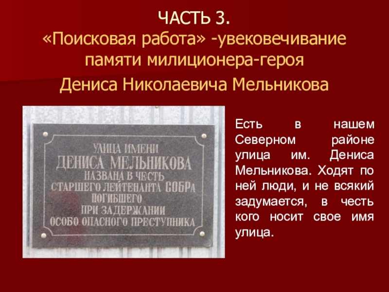 в нашем Северном районе улица им. Дениса Мельникова. Ходят по ней люди, и не всякий задумается, в честь кого носит свое имя улица.