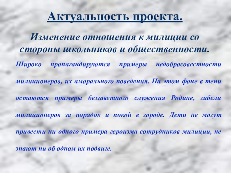 примеры недобросовестности милиционеров, их аморального поведения. На этом фоне в тени остаются примеры беззаветного служения Родине, гибели милиционеров за порядок и покой в городе. Дети не могут привести ни одного примера героизма сотрудников милиции, не знают ни об одном их подвиге.