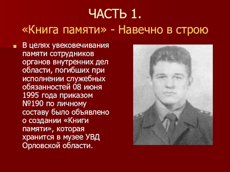памяти сотрудников органов внутренних дел области, погибших при исполнении служебных обязанностей 08 июня 1995 года приказом №190 по личному составу было объявлено о создании «Книги памяти», которая хранится в музее УВД Орловской области.