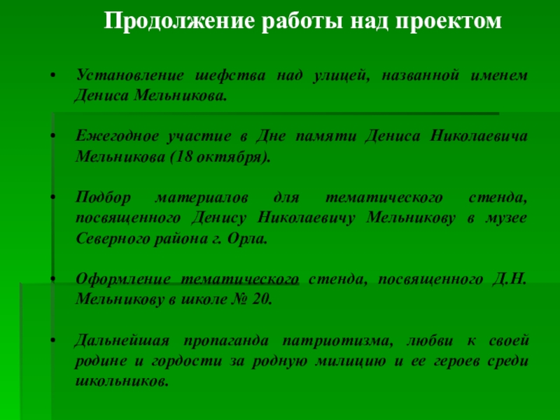 Установление шефства над улицей, названной именем Дениса Мельникова.
