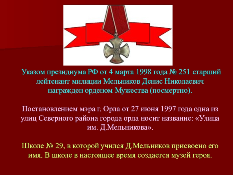 лейтенант милиции Мельников Денис Николаевич награжден орденом Мужества (посмертно).