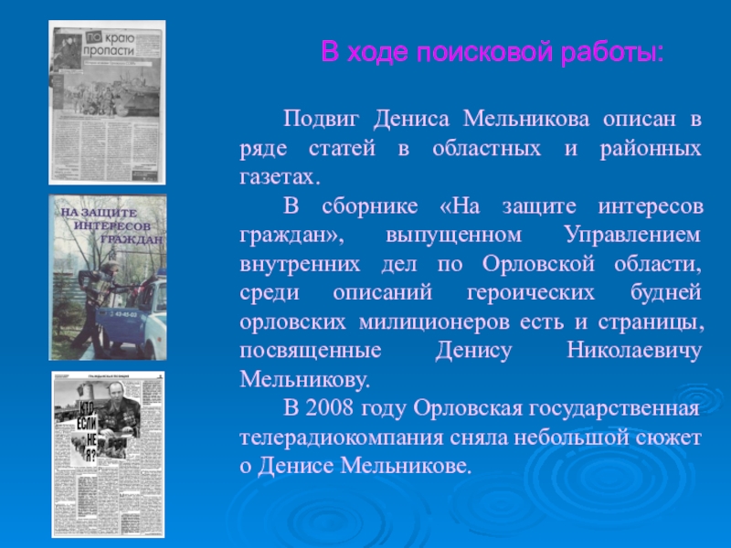 Слайд 13Подвиг Дениса Мельникова описан в ряде статей в областных и районных