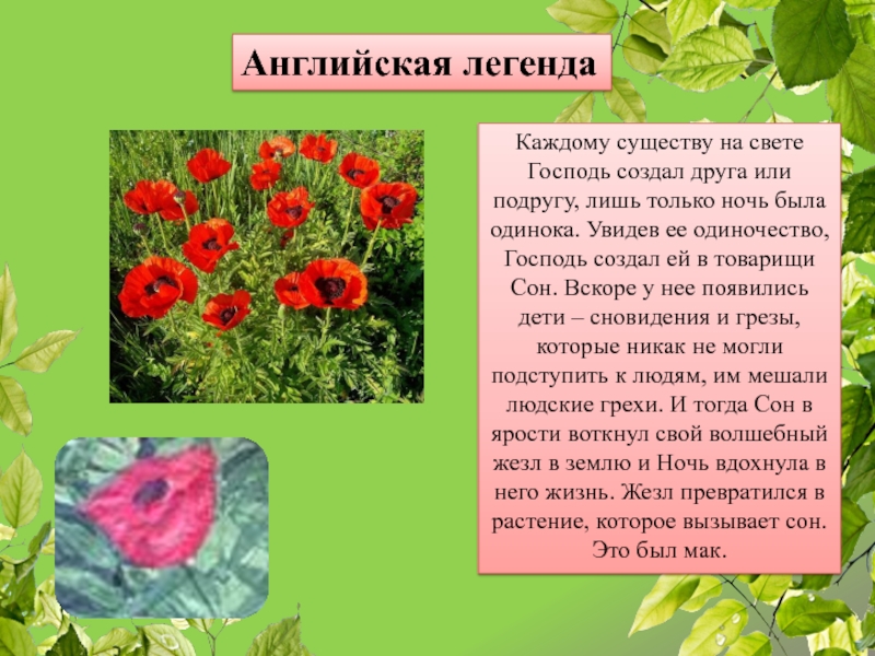 только ночь была одинока. Увидев ее одиночество, Господь создал ей в товарищи Сон. Вскоре у нее появились дети – сновидения и грезы, которые никак не могли подступить к людям, им мешали людские грехи. И тогда Сон в ярости воткнул свой волшебный жезл в землю и Ночь вдохнула в него жизнь. Жезл превратился в растение, которое вызывает сон. Это был мак.
