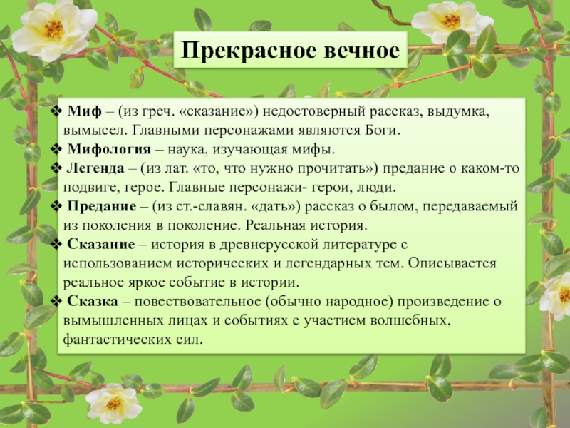 Миф – (из греч. «сказание») недостоверный рассказ, выдумка, вымысел.
