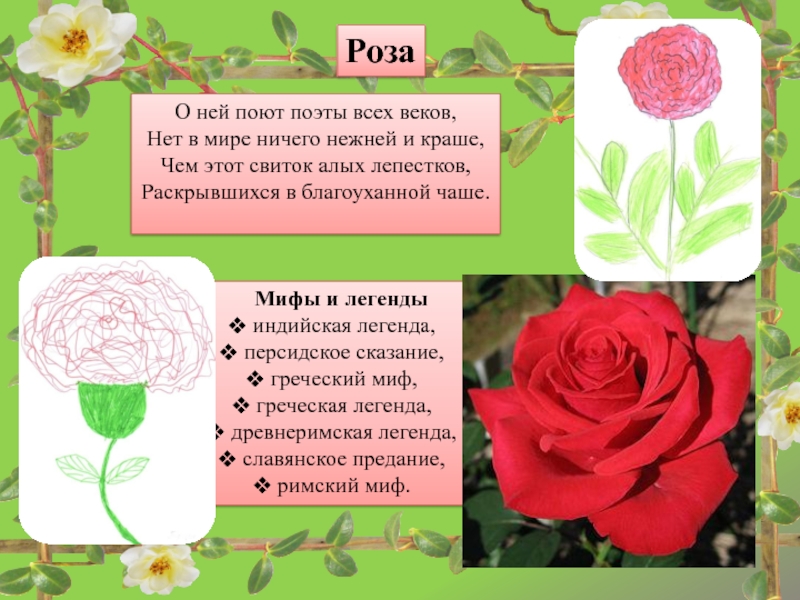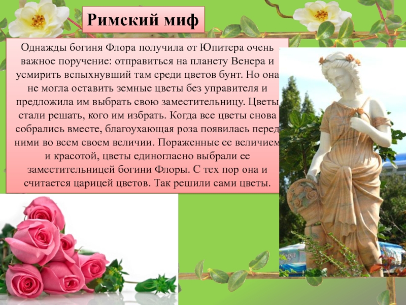 на планету Венера и усмирить вспыхнувший там среди цветов бунт. Но она не могла оставить земные цветы без управителя и предложила им выбрать свою заместительницу. Цветы стали решать, кого им избрать. Когда все цветы снова собрались вместе, благоухающая роза появилась перед ними во всем своем величии. Пораженные ее величием и красотой, цветы единогласно выбрали ее заместительницей богини Флоры. С тех пор она и считается царицей цветов. Так решили сами цветы.