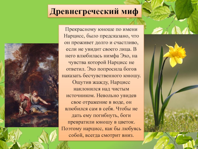 долго и счастливо, если не увидит своего лица. В него влюбилась нимфа Эхо, на чувства которой Нарцисс не ответил. Эхо попросила богов наказать бесчувственного юношу. Ощутив жажду, Нарцисс наклонился над чистым источником. Невольно увидев свое отражение в воде, он влюбился сам в себя. Чтобы не дать ему погибнуть, боги превратили юношу в цветок. Поэтому нарцисс, как бы любуясь собой, всегда смотрит вниз.